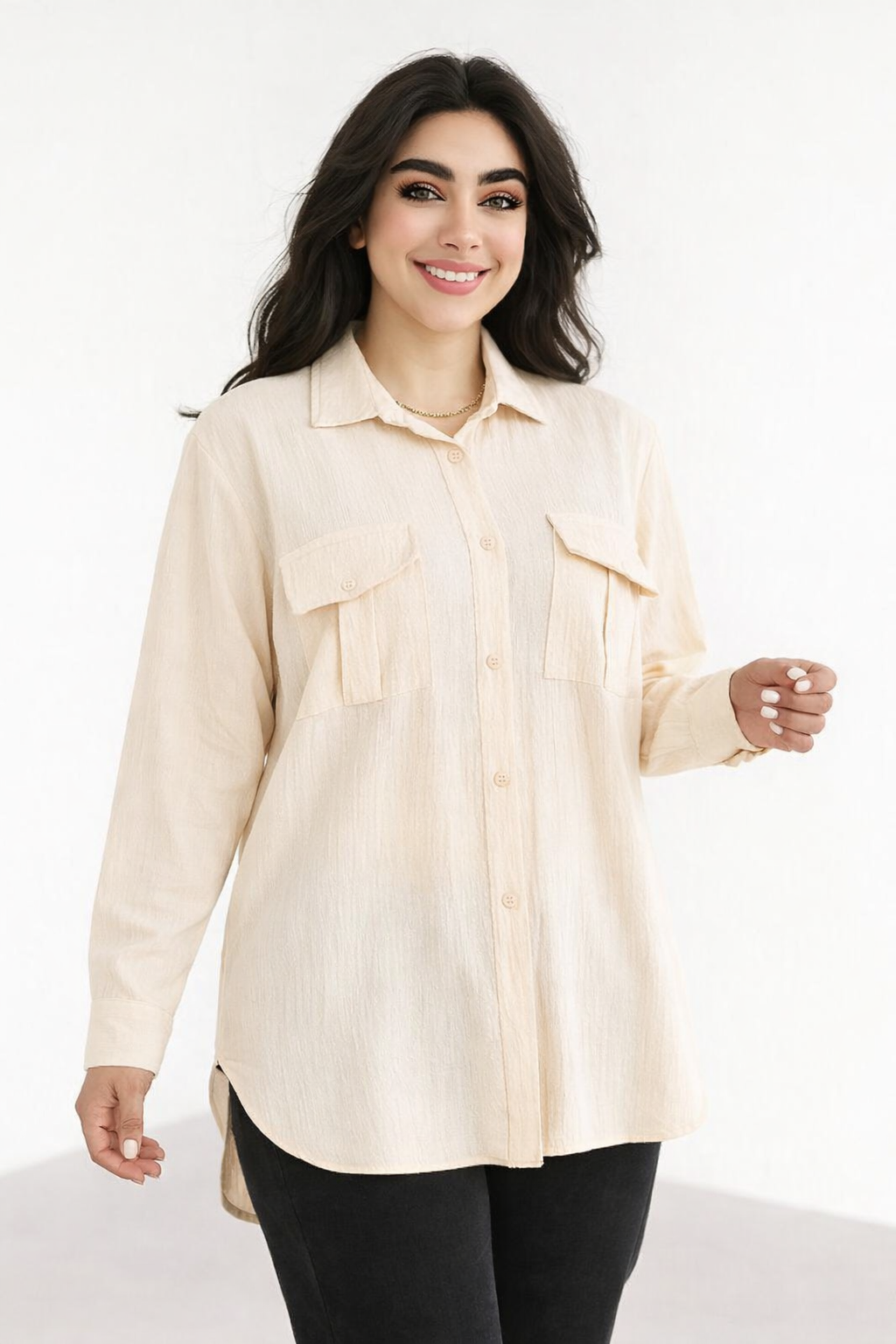 شومیز زنانه قواره دار سایز ۴۴ الی۴۸ قد کار ۸۰ جنس پفکی خارجی سبک و راحت جیب دار رنگبندی: صورتی پاستیلی/سبز پاستیلی/کاربنی/نسکافه ای/سفید/کرم/طوسی